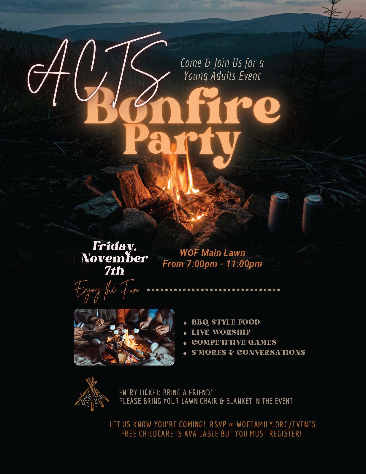 🔥 BONFIRE NIGHT ALERT! 🔥 Hey young adults (ages 18–35) — it’s time to kick back, connect, and vibe out at the ACTS Bonfire here at Word of Faith! Must be 18yrs-35yrs